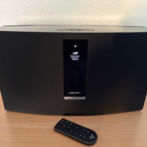 Bose SoundTouch trådløs højttaler i sort. Kompakt højttaler med frontdisplay og betjeningsknapper på toppen. Enheden leveres med strømledning og fjernbetjening som vist på billedet. Velegnet til brug i stue, køkken eller soveværelse til afspilning af musik fra kompatible kilder afhængigt af model og tilslutningsmuligheder.