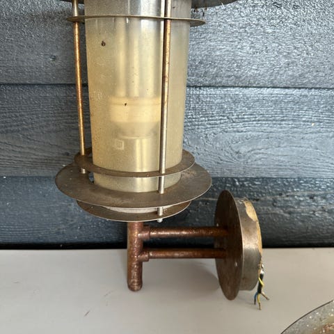 Sælger 3 stk. ældre udendørs væglamper i metal med glas. De har et flot rustikt og patineret look, som passer perfekt til et ældre hus, sommerhus, gårdmiljø eller som dekorativ belysning.
