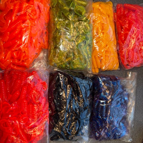 Stort lot gummihaler/jigs/shads. Enkelte har været monteret, men de aller fleste er nye/ubrugte. Ca. 11-28cm. Se billede.