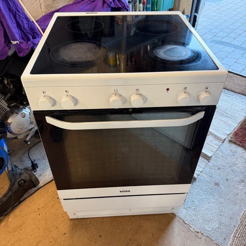 Voss keramisk komfur med glaskeramisk kogeplade og integreret ovn. Komfuret har flere kogezoner på den plane kogeplade og mekaniske drejeknapper på fronten til betjening af både plader og ovn. Ovnrum med flere riste og bageplader samt glaslåge med håndtag i fuld bredde. Fritstående model i hvid med sort glasfront og sort kogeplade, egnet til placering i almindeligt køkkenmiljø.
