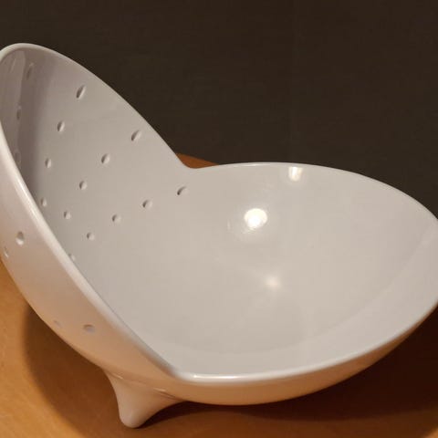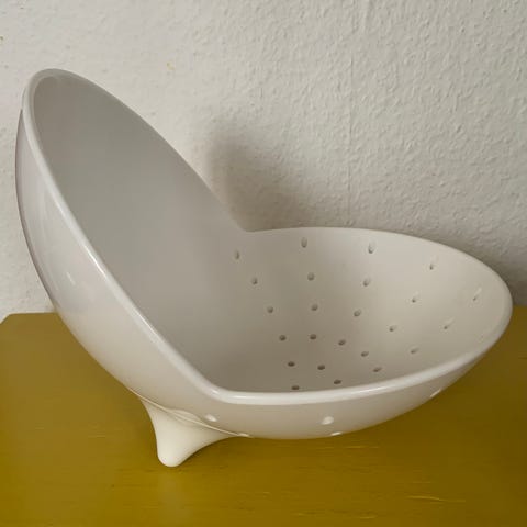 Dette livlige gule dørslag, designet af den danske designer Ole Jensen, imponerer med sin vidunderlige pop-art-følelse. Oprindeligt blev det ikoniske design udviklet i 1990'erne i et prisvindende samarbejde med porcelænsproducenten Royal Copenhagen. Dette særlige møbel er den moderne, funktionelle plastikversion fra Room Copenhagen, som perfekt har oversat designets legende ånd til hverdagsbrug siden 2013. Designsproget er typisk for Jensen: blødt, organisk og næsten skulpturelt. Med sine slående, asymmetriske linjer og dristige farver er dette dørslag alt for smukt til at blive gemt væk i et skab. Takket være sin flade bund og brede åbning er det også en perfekt frugtskål, hvor hullerne i bunden sikrer optimal luftcirkulation, så din frugt holder sig frisk i længere tid. Et sandt designstatement til køkkenet, der kombinerer funktionalitet med letheden fra skandinavisk nyt design.