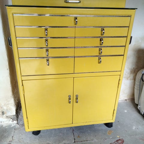 Superfint gammelt tandlægeskab i træ på hjul. Den angivne højde på 86 cm er uden topkanten der er på 10 cm. Farven er creme/lys beige med krom beslag. Kan enten bruges ‘råt’ som det er - eller blive fin med lidt knofedt og maling.