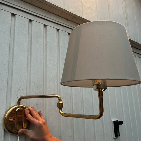 Væglampe i sort med messingfarvet arm og rund vægplade. Lampen har en halvkugleformet skærm med mat overflade og inderside i gylden/ messingfarve, som giver et varmt lys. Monteres på væg og tilsluttes med ledning, der hænger ned fra lampen. Velegnet som belysning ved sofa, seng eller læsehjørne.