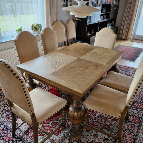 Spisebord med 2 plader og 6 stole (ombetrukket)