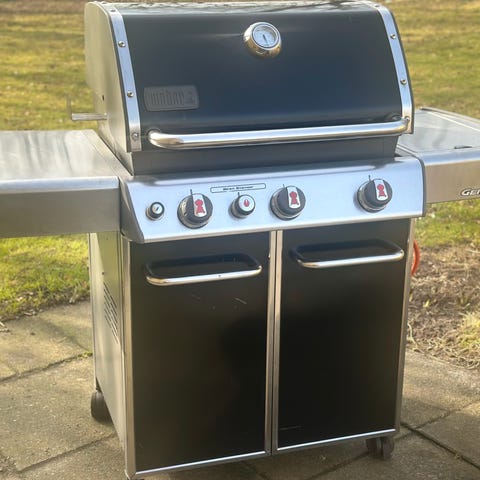 Fin, men brugt grill. Alt fungerer 100%. Plade over sidebrænder har været lukket, medens brænderen var tændt 🙈 Plads til 5 kg gas flaske under grillen og 10/11 kg på siden, bag flaskeskjulet. Grillen har rust pletter, men ikke “kriminelt” Gasregulator medfølger. Gasflaske medfølger ikke. Kan ses