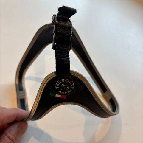 Tre Ponti sele til hund i sort. Selen er justerbar med remme og spænder og har polstrede flader mod hundens krop. Reflekterende detaljer på remmene øger synligheden i mørke. Egnet til gåture og daglig brug til hunde, hvor der ønskes en sele frem for halsbånd. Selen gør at hunden ikke trækker.