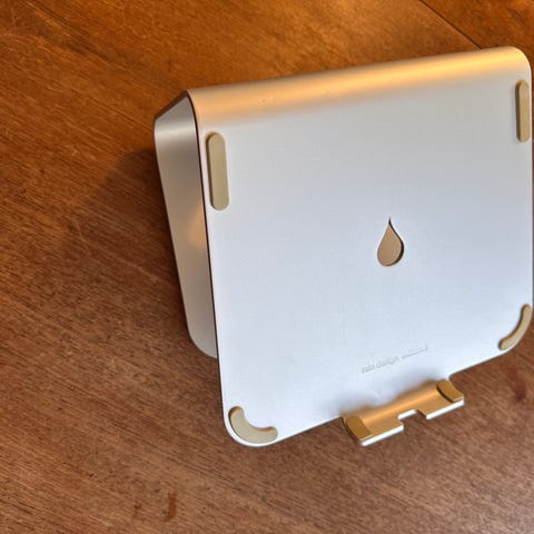 Rain Design mStand laptopstand i grå aluminium. Standeren er udført i et enkelt, buet design med gummifødder på overside og underside for at holde computeren stabil og beskytte overflader. Der er hul på bagsiden til kabelføring. Velegnet til bærbare computere, hvor man ønsker hævet skærmhøjde på skrivebordet.