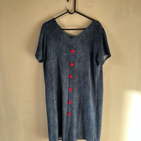 & Other Stories kjole til kvinder i størrelse Xl. Kjolen er i blå denim og har et kropsnært, langt snit med mønsterdetaljer. Ærmeløs model med dyb v-udskæring foran og bagpå. Velegnet som fest- eller aftenkjole Den blev kun brugt i et par timer Haledetaljen giver et særligt touch.