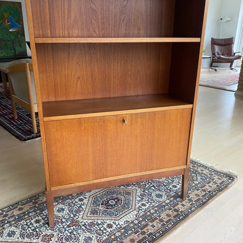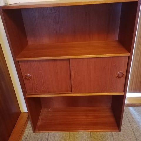 Reol skab i teaktræ med åben reol øverst og skab med skydelåger nederst. Øverste del har flere åbne hylder i forskellige højder til bøger, dekoration eller opbevaring. Nederste del består af et lukket skab med to skydelåger og indvendig opbevaringsplads, egnet til fx service, glas eller andre ting, der ønskes gemt af vejen. Møblet er velegnet til stue, spisestue eller kontor som kombineret opbevarings- og udstillingsmøbel.
