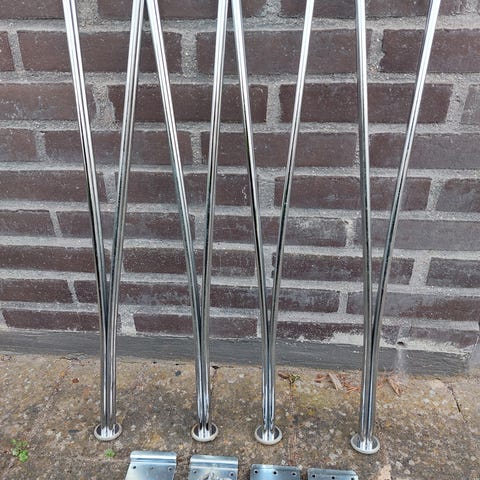 Fritz Hansen, andet, Ubrugte spændben fra Fritz Hansen, forkromede. Fire styks, model B4. Med tilhørende benpropper/»sko», ekskl. monteringsbeslag (og skruer hertil).