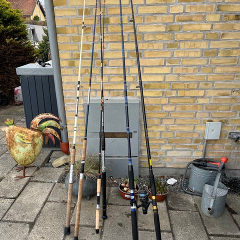Fiskesæt bestående af flere delteles fiskestænger, forskellige fiskehjul, grejboks med gennemløbere, pirke, forfang og andet småt grej samt opbevaringstaske. Sættet indeholder både spinne- og multihjul samt forskellige typer agn og tilbehør, egnet til alsidig lystfiskeri fra kyst, båd eller havn. Velegnet som komplet udstyrspakke til fiskeri med kunstagn og forfang.