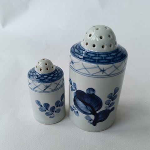 Smuk blå og brun Tranquebar salt/peber, Aluminia/fajance/1903 FRA 99,-