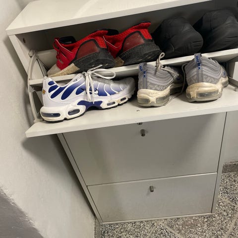 Skabet er i pæn brugt stand og fungerer som det skal. Der er almindelige brugsspor, herunder et mindre mærke/ridse indvendigt, som ses på billedet.