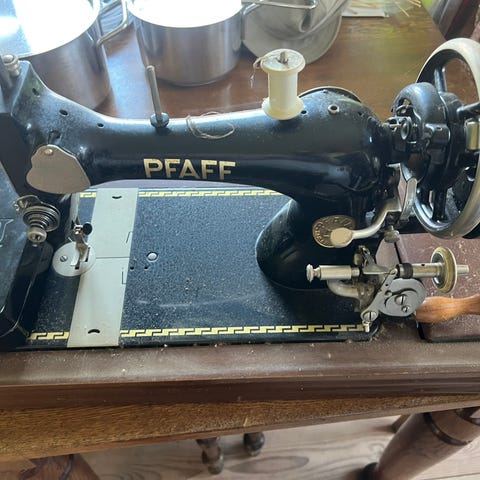 Antik Pfaff symaskine med bord og stel i støbejern