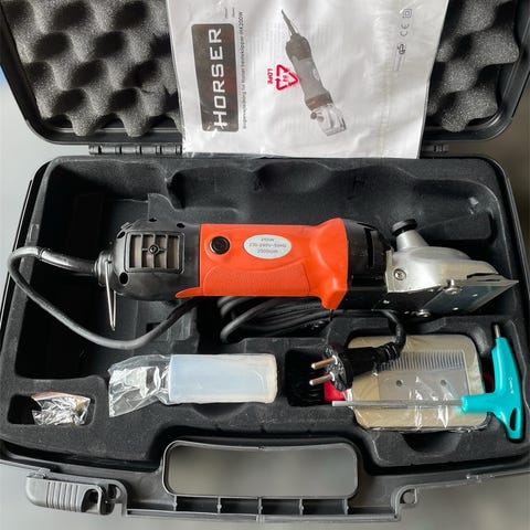 Mekupa hesteklipper i plastkuffert. Klipperen har orange håndtag og leveres med tilbehør som olieflaske, rensebørste og ekstra smådele, placeret i formskåret skumindlæg. Velegnet til klipning og pelspleje af heste. Strømforsynes via ledning til 230V stik.