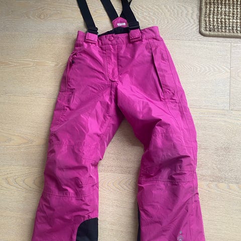 2117 skibukser i str. 164. Bukserne er brune med sorte forstærkninger nederst ved benene og har seler. Foran er der lommer med lynlås og klap. Velegnede som skibukser eller yderbukser til vinterbrug for børn i størrelse 164.