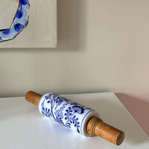 Kagerulle i hvid marmor med mørke årer. Velegnet til udrulning af dej til fx kager og tærter. Leveres med træholder, som kan bruges til opbevaring på bord eller i skuffe. Den glatte marmoroverflade gør det nemt at rulle dejen jævnt ud.
