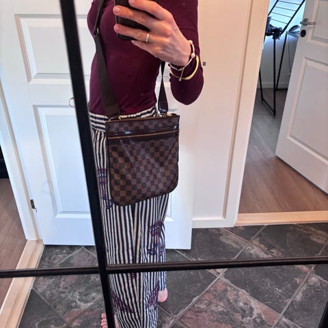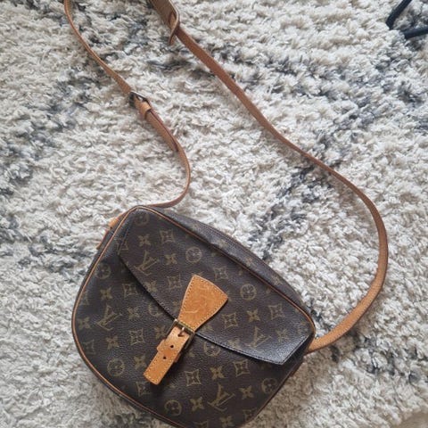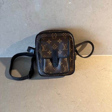 Louis Vuitton skuldertaske i sort læder til kvinde. Tasken har klaplukning med markant V-detalje i guldfarvet metal på fronten og præget monogrammønster i læderet. Den er udstyret med et kort bærehåndtag samt en aftagelig og justerbar skulderrem med guldfarvede metalbeslag. Bagsiden har en udvendig lomme, og bunden er fast for bedre formstabilitet. Velegnet som hverdagstaske eller til brug, hvor der er behov for plads til personlige ejendele som pung, telefon og småting.