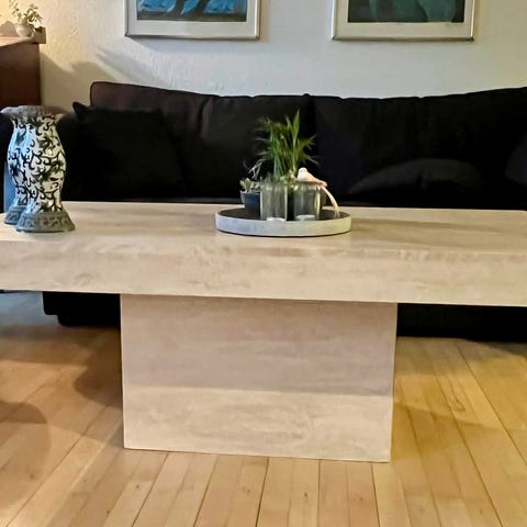 Vi formoder at bordet er ægte travertin, da det er meget tungt og har den karakteristiske kolde stenoverflade og struktur, men vi kan ikke garantere det 100 %.