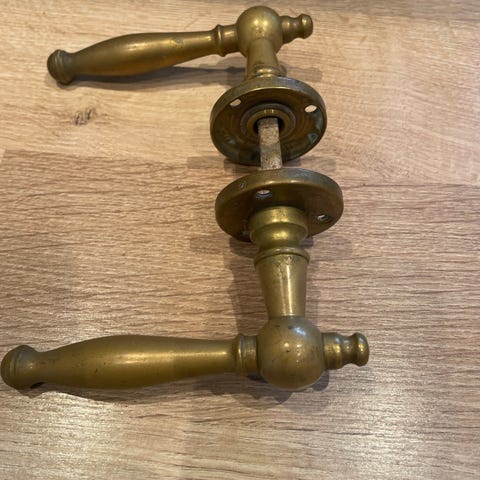 Blandet parti dørgreb og beslag i messing. Indeholder forskellige typer greb, rosetter og plader, flere med træhåndtag. Egnet til døre og eventuelt reservedele eller renoveringsprojekter. Sælges samlet som på billederne.