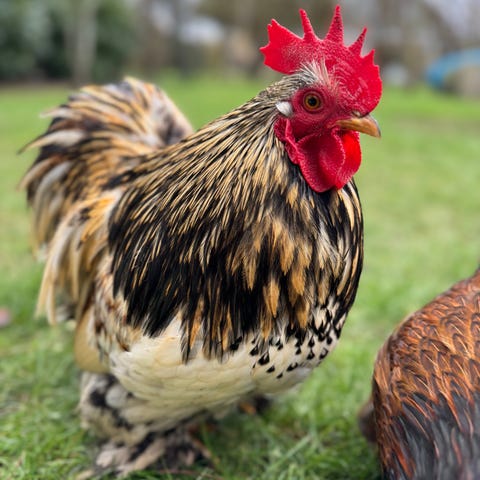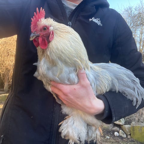 Jeg giver denne smukke hane af racen tværstribet skovhøne væk. Den er ca. 7 - 8 måneder gammel. Den har levet et godt liv i min have, hvor den har kunnet gå rundt og spise orme og græs, og den har udelukkende fået økologisk foder. Jeg vil gerne nøjes med at have høns i fremtiden, så derfor skal den nu videre.