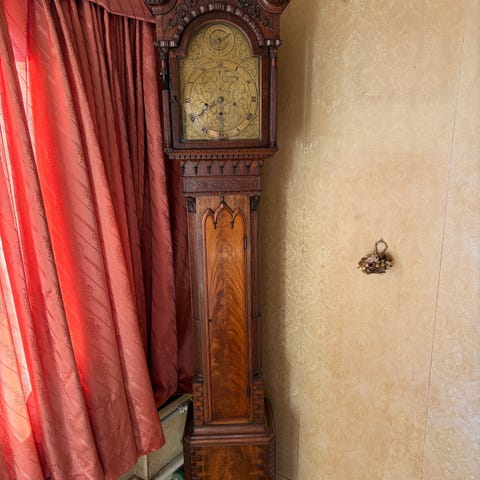 Stueur standur i træ med udskåret top og rektangulær fod. Uret har en stor, dekoreret messingurskive med romertal og mindre øverste skive. Kabinettet fremstår i mørk træfinish med fyldningslåge på fronten. Bornholmer ur. Totnes. Går og holder tiden. Med dato visning.