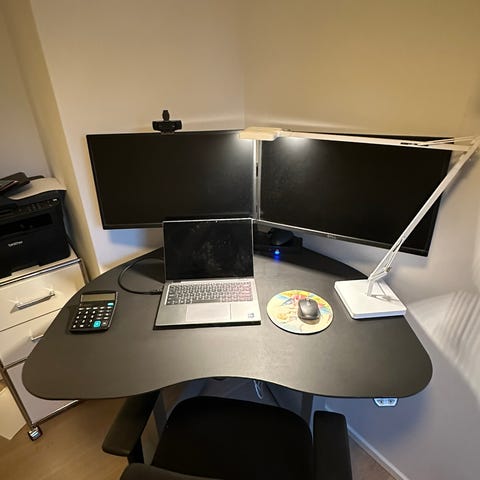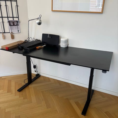 Stort og solidt skrivebord med elektrisk højdejustering, så det kan bruges både siddende og stående. Perfekt til hjemmekontor eller arbejdsplads.