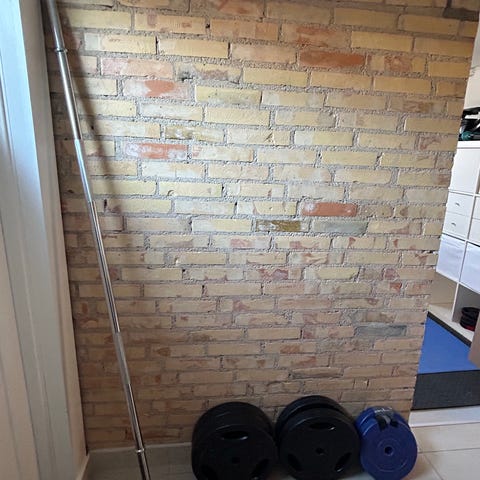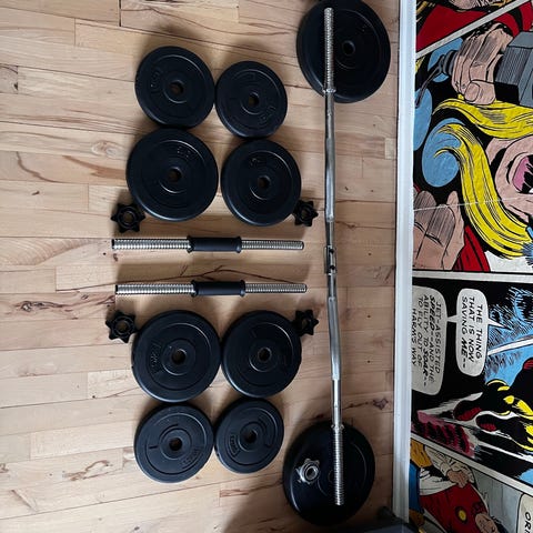praktisk sæt med vægtstang og vægtskiver – perfekt til hjemmetræning.