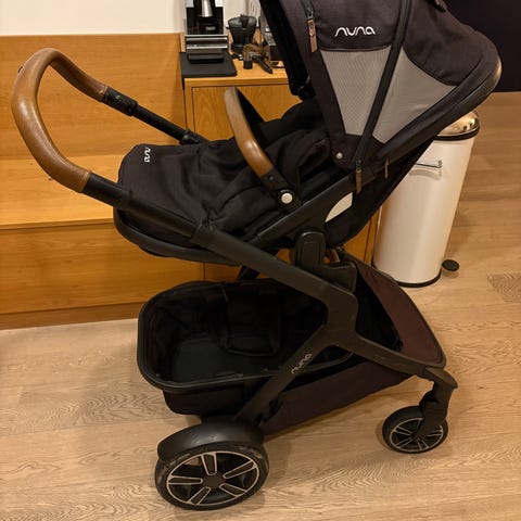 Nuna barnevogn og klapvogn kombivogn i sort. Vognen består af stel med liggedel/barnevognskasse samt separat klapvognsdel. Håndtag med læderlook og store hjul, egnet til brug i by og natur. Sættet kan anvendes fra nyfødt med liggedelen og senere med klapvognsdelen, når barnet kan sidde selv.