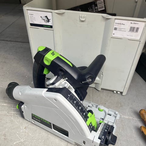 Festool TS 55 EBQ dyk-/skinnesav med 160 mm klinge. El-drevet rundsav beregnet til præcisionssnit i træ og pladematerialer, blandt andet i kombination med føringsskinne. Hastighed kan indstilles via drejehjul på håndtaget. Leveres i Festool Systainer opbevaringskasse med indsats til maskinen og tilbehør.