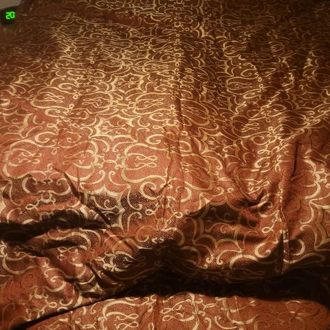 Lækkert amerikaner-sengetæppe til King size (kæmpestor) seng. Vatteret og vendbart, aldrig brugt. Flotte douche rødlige og blålige farver. Ensfarvet "guld" på bagsiden