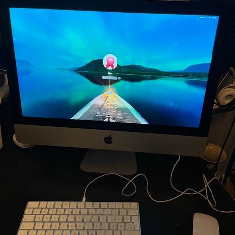 Apple iMac stationær computer med 17" skærm i sølvfarvet aluminium. Enheden har indbygget skærm, fod og flere tilslutningsmuligheder på bagsiden, herunder USB-porte og Thunderbolt-porte. Velegnet som alt-i-én computer til generelt kontor- og hjemmebrug. Strømkabel medfølger ifølge billederne.