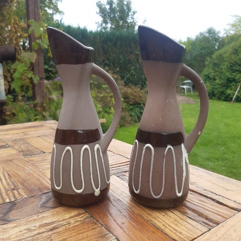 Vintage kander fra det nu lukkede Strehla i daværende Østtyskland. Højglansglasur i brune nuancer (med glød) og hvid-spættet. Mærket i bund med Strehla-logo og "9021".