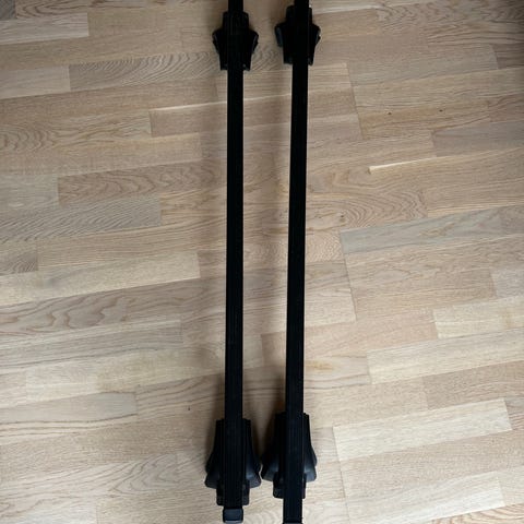 Thule tagbøjler i sort. Sættet består af to tværstænger med tilhørende fødder og beslag til montering på bilens tag. Egnet til montering af f.eks. tagboks, cykelholder eller anden taglast, afhængigt af bilmodel og kompatibilitet med Thule-systemet. Kan evt. leveres da jeg kører en del rundt i mit job. Ellers kan de afhentes.