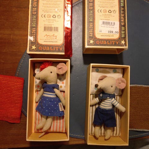 Sættet består af små stofmus, der ligger i hver deres æske udformet som tændstikæsker. Musene er syet i tekstil med broderede detaljer, og æskerne er af pap med trykt motiv. Velegnet som rolleleg for børn eller som samlerobjekt til Maileg-universet. Brugsspor forekommer på æskernes kanter, men ellers i super stand.