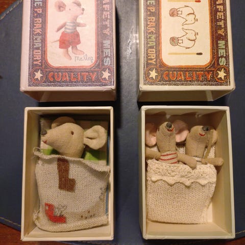 Maileg mus i tændstikæske dukke med sengetøj. Sættet består af små stofmus klædt i tøj og lagt i hver sin tændstikæske med madras, pude og tæppe. Æskerne er udformet som store tændstikæsker med tryk på siderne. Egnet som legetøj til børn eller som samlerfigur og dekoration på børneværelset.