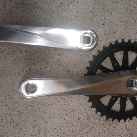 Cykel kranksæt med klinger. Sættet består af to pedalarme og en klinge-enhed med flere tandhjul. Egnet som reservedele eller udskiftning på cykel med firkantet krankaksel. Materiale ser ud til at være metal/aluminium på armene og stål på klingen. 2 stk krank sæt med 3 klinger ( Mtb ) prisen er pr stk