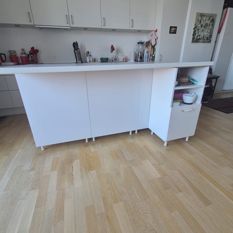 Vi sælger denne køkken ø som vi har haft meget gavn af i en kort periode, da den har givet ekstra skabsplads og virket som spisebord.