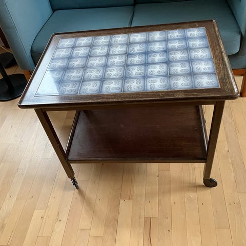 Rullebord i træ med en glasplade på toppen. Den har en hylde nederst og hjul.,Afhentes i:,Røde Kors Tuborgvej / København NV (101),Bemærk at mail, chat og beskeder ikke besvares, og varen skal købes på knappen "Gå til varen"