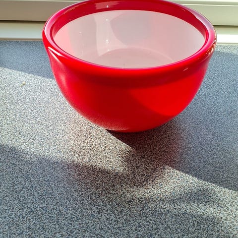 Holmegaard skål "Rød palet" mundblæst glas med hvid inderside. Designet af Michael Bang,Afhentes i:,Røde Kors Tuborgvej / København NV (101),Bemærk at mail, chat og beskeder ikke besvares, og varen skal købes på knappen "Gå til varen"