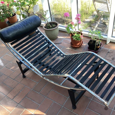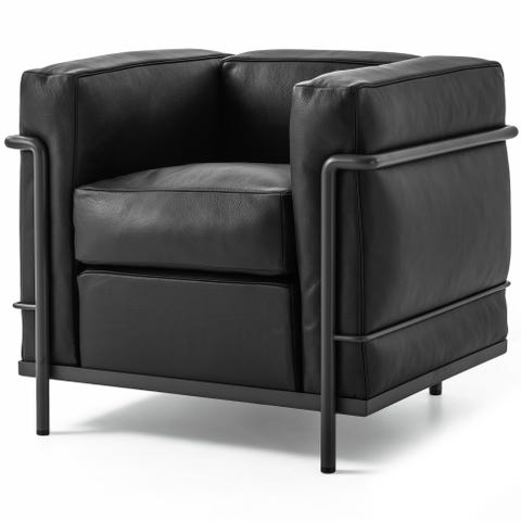 2 stk lænestole inspireret af Le Corbusier LC2 med et flot rørformet stel i rustfrit stål og puder betrukket med sort læder.