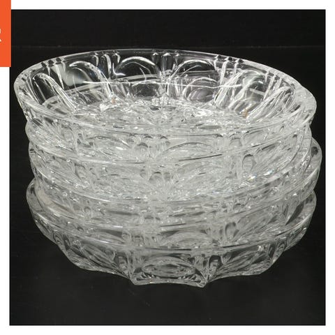 Sæt af fire krystal fade, hver med en diameter på 12 cm. De er dekorativt skåret med et stjernemønster og har en praktisk hank i den ene ende for nem transport eller ophængning. Disse fade er ideelle til servering af mindre fødevarer eller som dekoration på bordet.