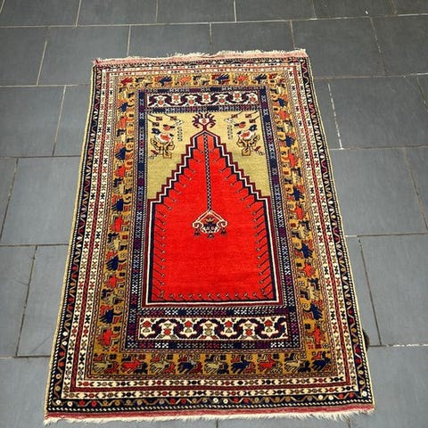 Oprindelse: Tyrkiet; model: håndvævet tæppe af uld på bomuld, 195 x 128 cm, 21. århundrede, beskadiget og har brug for restaurering, professionelt rengjort. Klik på den blå "gå til varen" knap, for at købe eller byde på denne vare. Den samlede pris vil blive vist inden du afgiver dit bud.