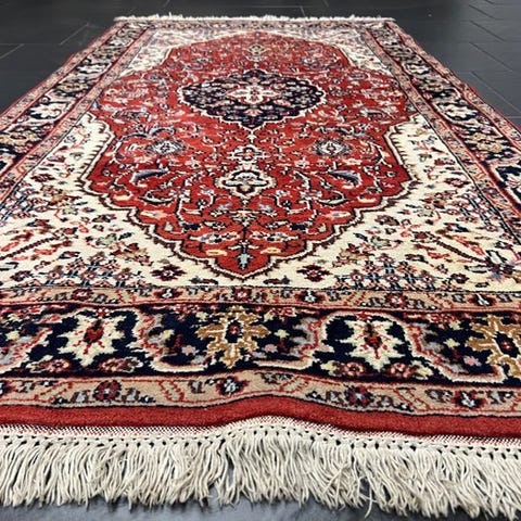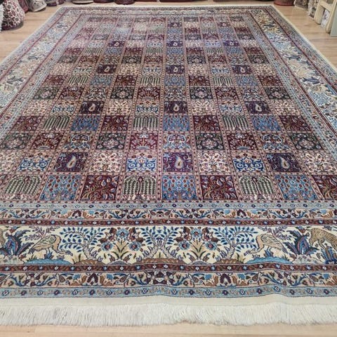 Håndkundsket Orientalsk tæppe Ghoum - Royal Felder Kashmir, fremstillet i Indien, målene 2,45 x 3,00 m, uld på bomuld, flerfarvet med rød, beige og blå, cirka 30 kg, i meget god stand. Klik på den blå "gå til varen" knap, for at købe eller byde på denne vare. Den samlede pris vil blive vist inden du afgiver dit bud.