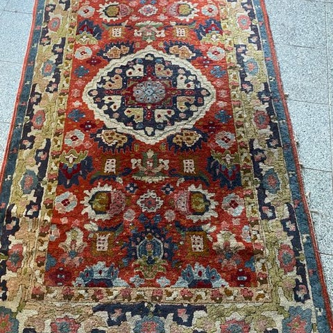 Antik tyrkisk tæppe, knyttet rundt omkring 1940'erne, klassisk ikonografi, uld på uld, i generelt god stand med lette slidmærker på grund af alder, vegetabilske farver, uld på uld. Cm 190x120.