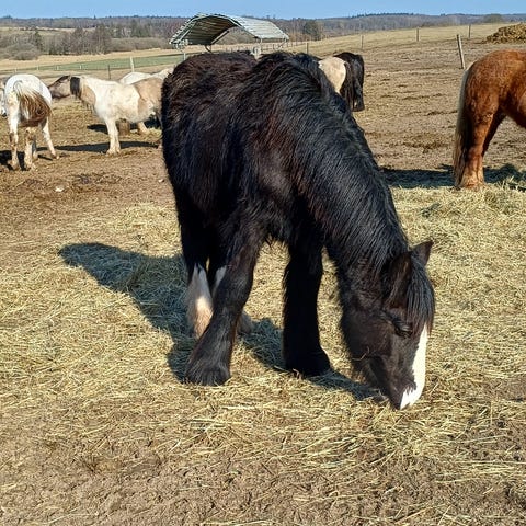 Han er sort broget med skjult rød gen. Pssm1 negativ.