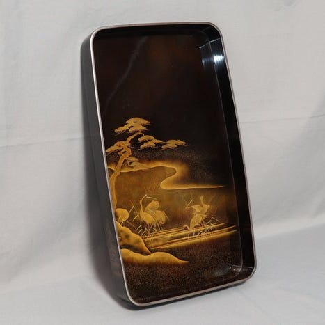 På den side, der vender mod lytteren eller tilskueren, viser basen en scene af to fiskere, der hiver i et reb for at fortøjle deres båd, deres brede koniske hatte fremhævet med mother-of-pearl 螺鈿 (raden) inlay. Den lodrette støtte er udsmykket med et panel, der viser ’Threeleaf arrowheads’ 沢瀉 (omodaka), ledsaget af to kanji indridset i et medaillon til venstre.