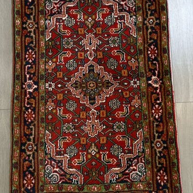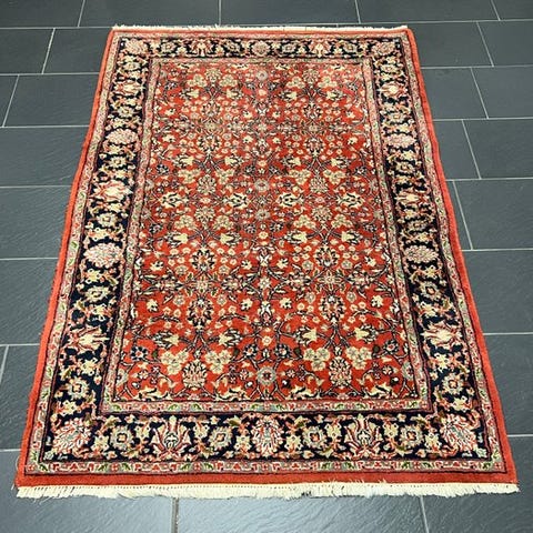 Til salg står et håndknyttet orientteppich i det klassiske Täbriz-design, der med et stort centralt medaillon og fine florale arabesker skaber en elegant og meget harmonisk helhedsvirkning.