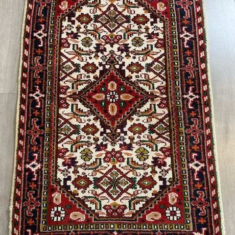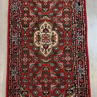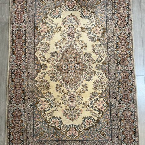 Indefeltet er holdt i en lys creme-beige nuance og bestemmes af et stort, rigt ornamenteret medaillon. Fra dette centrum udfolder sig talrige buede ranker, blomster og palmetter, som fordeles symmetrisk over hele feltet og giver tæppet en særligt fin og detaljeret struktur.
