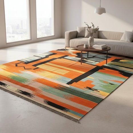 Dette håndvævede designer-kelim imponerer med sin friske farvepalette og det klare geometriske mønster. Det rolige grønne midterfelt fremhæves af et centralt diamantmotiv og omgives af farverige zigzag-elementer. Den harmoniske kombination af gul, blå, rød og naturtoner giver tæppet en levende, men afbalanceret udstråling.